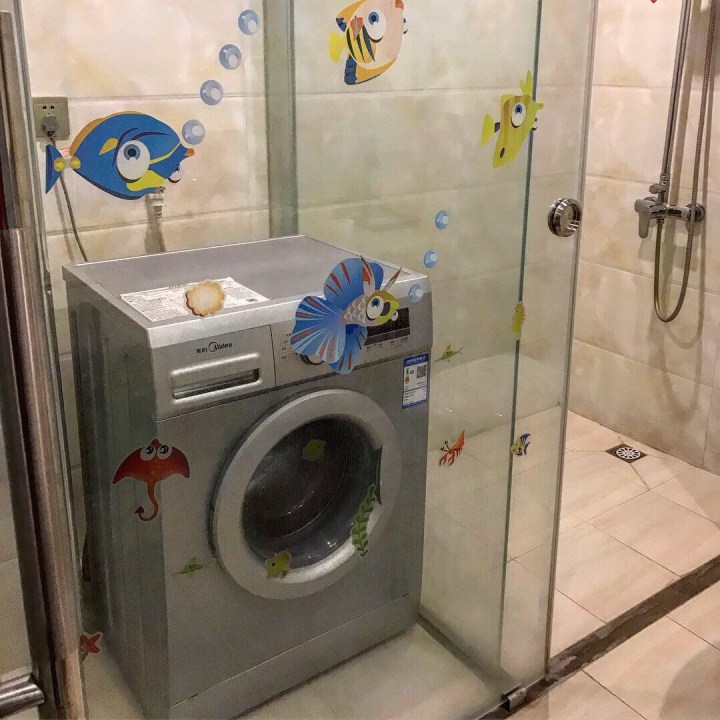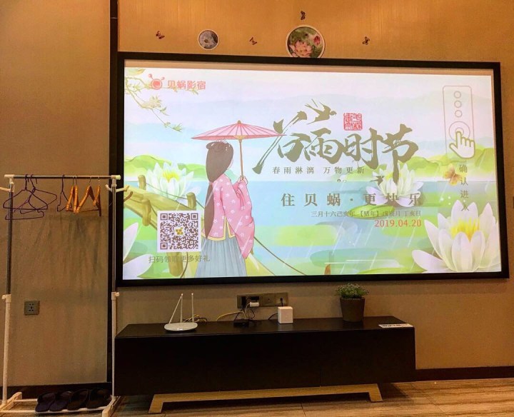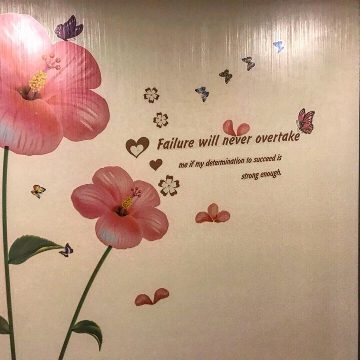 We got to the hotel eventually and were greeted by a Happy Christmas sign. Two sweet girls were sitting surrounded by mounds of detritus and I showed them our booking, hearts sinking even more. We conversed through google translate. It was raining and we had to go outside, down the road and around the corner to take the shaky and filthy lift to our room. What a room it was and rather different to our gorgeous harbour view room at the W in HK. It was huge, but depressing, very dirty but rather wonderful in that it had a massive t v screen, showing strange programmes, a washing machine in the shower and several cod philosophical platitudes and floral murals on the walls. Who couldn’t love that? Oddly, the cliches were in English. God knows why. It was hardly a tourist place. I didn’t want to put my bare feet on the filthy floor but the sheets seemed to be clean. I tried not to think too closely about that. It was not a good night.