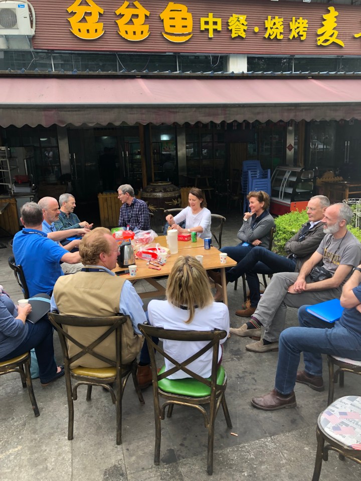 Yesterday, we all had to go for a medical to get our Chinese driving licences. A bus took us off to a hospital at one of the cities 14 universities for the checks. First off was an eye test of sorts. We had to sit on a chair cover each eye, and say the direction of the M type character, all done through a translator. Then, we had to sit with our hands splayed in front of us to be photographed. They need to see that you have all your digits to hold the wheel, presumably. Getting the rally rabble in order is not an easy task and it did not run smoothly. Mainly, because the computer kept breaking down. Opposite the hospital there was a grubby, but characterful restaurant where we all sat outside drinking tea and coffee until the first part of the process was finished. It took so long that our leader, Liz organised lunch there for us.