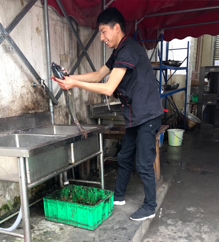 Next to where we were sitting, there was a live fish tank. Periodically, a boy would come with a tiny net to try to catch a very large fish. He flicked the hapless fish out of the tank and then bludgeoned it with a stick. He was not very good at either process and the poor flapping fish did not have a quick death. Fish was not ordered for our lunch after witnessing the drawn out murder, but they did serve us a tasty feast of lots of vegetables, egg and pork and refreshing ale.