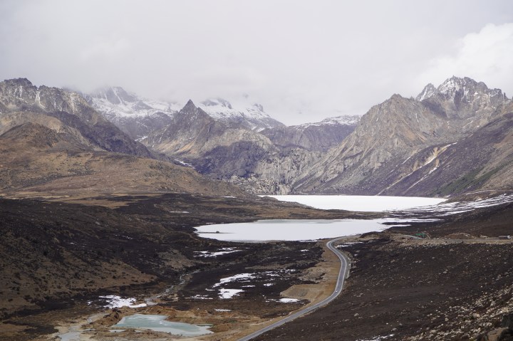 The landscape was bleak but really beautiful. We saw frozen lakes, snowy, jagged mountains, isolated villages, a massive monastery, and monks galore. It snowed for a little while too. Wet light snow and hail. It was also freezing cold and windy. We then dropped down to 2550 metre for our night halt. It was a shock to suddenly see some green vegetation again.