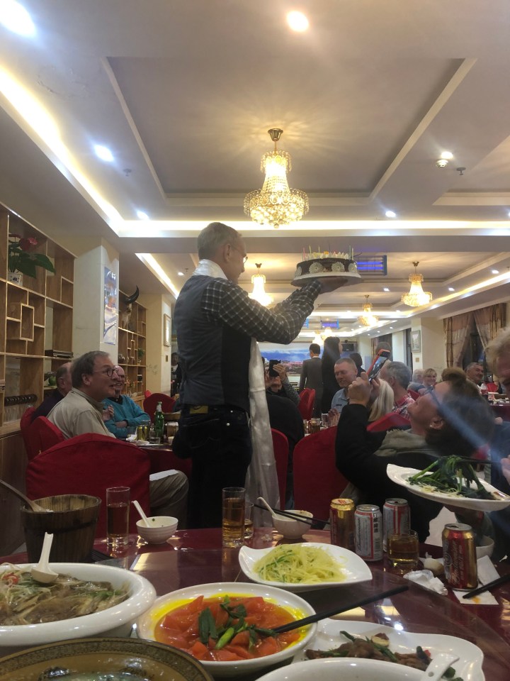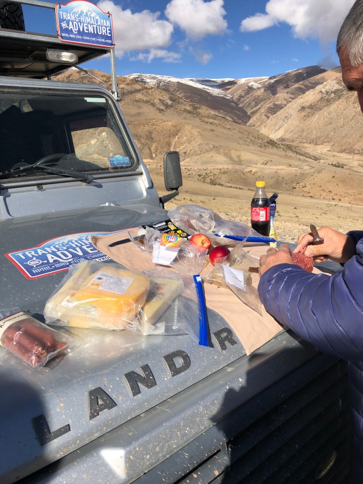 We went up to a high pass with the most beautiful view across to the snowy mountains. The two other Defenders were already there. Lovely Fritz has a whole stash of German sausage, Swiss cheese and pumpernickel stored inside a spare wheel on the roof, for coolness. A whole German delicatessen was laid out on the bonnet for Rudi’s birthday breakfast. What a feast we had, and the view was something else.