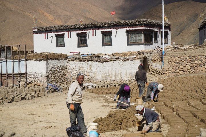 The Chinese road west has been generally excellent, so far. Yesterday, we passed Tibetan villages that had not had the hand of China, and some that had. The scenery was, as usual stunning. The normal high passes, yaks, a glacier, a sacred lake of ethereal colour and some very primitive farming. Horse drawn ploughs and even harrowing done by a man standing on a plank behind a horse. We passed people fashioning bricks from yak dung – a primitive shit brick factory. . The season at this altitude is very short and they are usually only able to grow high altitude barley.